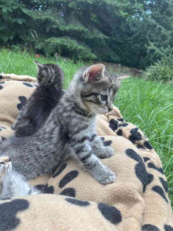 Zadám koťata, křížence kočky mainské mývalí a evropské, narozené 15.5. 2025. Koťata jsou zdravá, veterinárně ošetřena, odčervena, plně socializována, abnormalně vymazlená, zvyklá na děti, psy, kočky, doma a venku. Matka je menšího vzrůstu, cca 3 kg. Výživa kojeni/barf. K odběru v průběhu října.