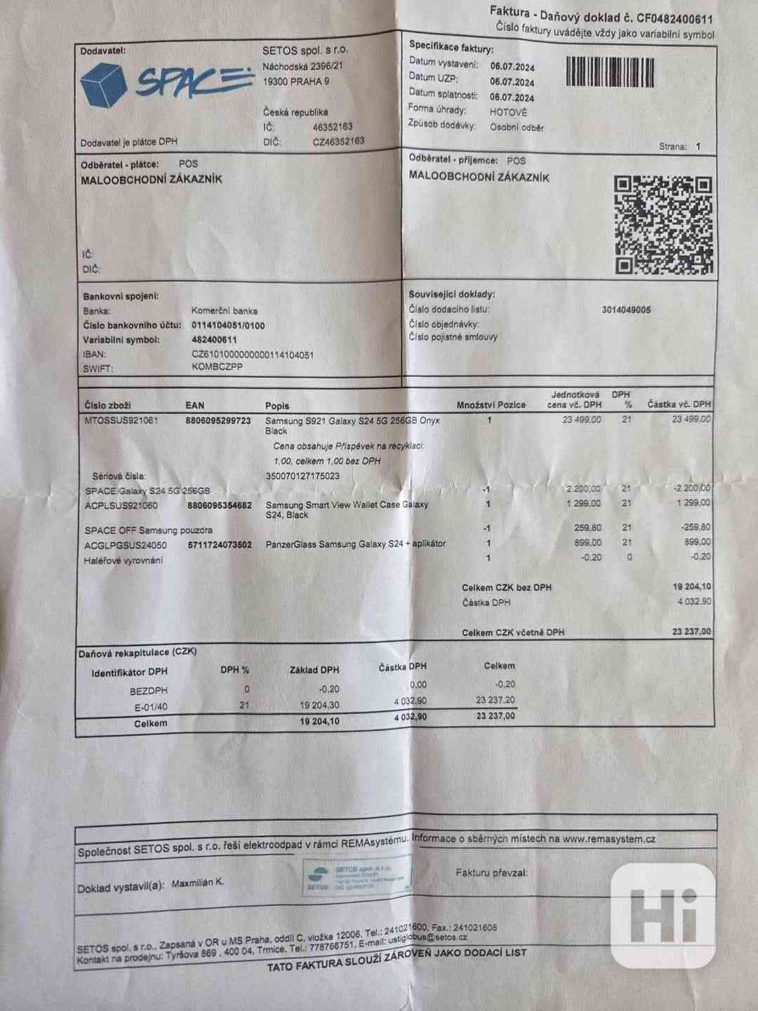Prodám Samsung S 921 Galaxy S24-5G,,256Gb,černý+kryt-slim,+sklo ochrana displeje,tovární nastavení,zakoupeno 6.7.2024(viz foto)ještě v záruce,není vůbec poškozený ani poškrábaný,je jak nový.cena:12800kč.Preferuji osobní předání.mob:606283490