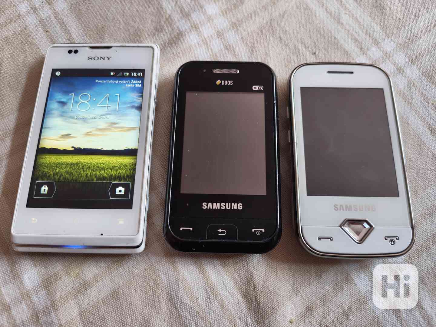 v pěkném stavu, Sony Xperia C1505 včetně nabíječky Kč 499,-, Samsung GT-E2652W s nabíjecím kabelem Kč 249,- (K.O. baterie) a Samsung GT-S7070 s nabíjecím kabelem (bez baterie).